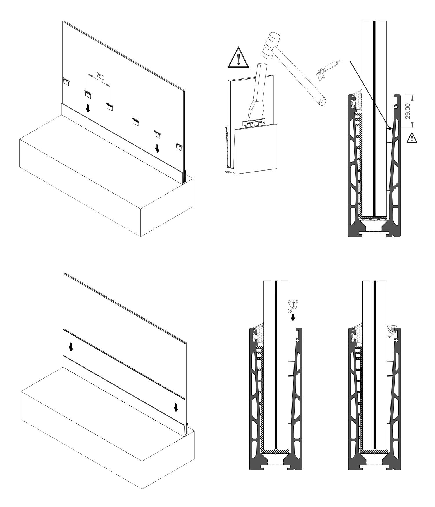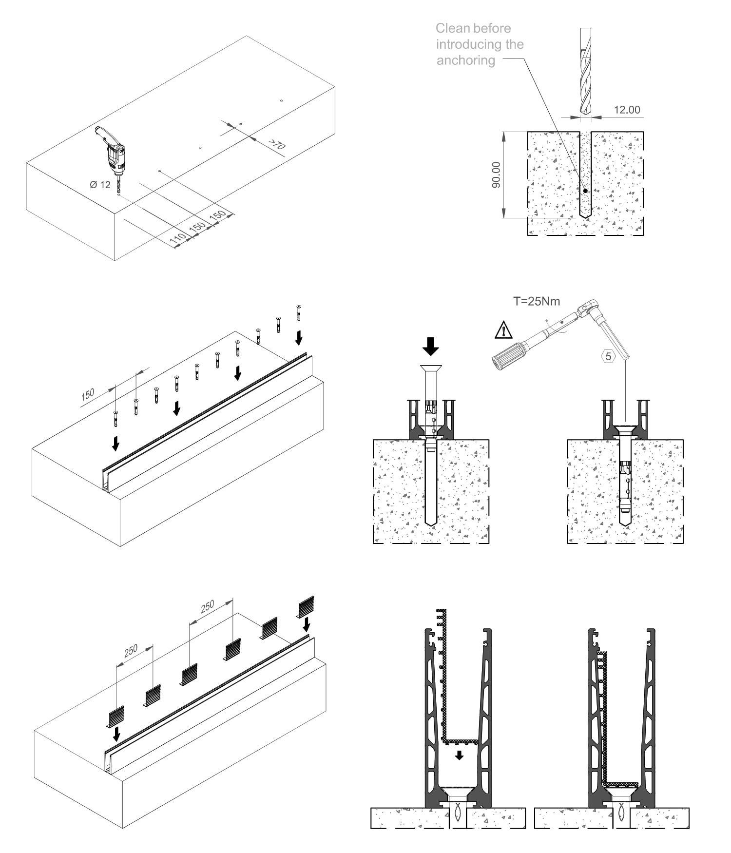 Kotevní otvory po 150 mm, umístění podložek a klínů po 250 mm